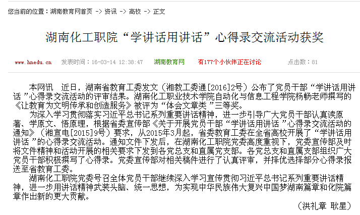 湖南教育网:湖南化工职院“学讲话用讲话”心得录交流活动获奖