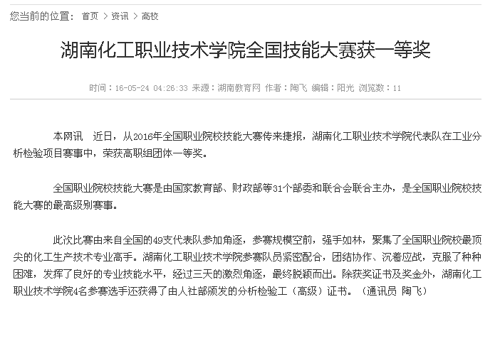 湖南教育网:湖南化工职业技术学院全国技能大赛获一等奖