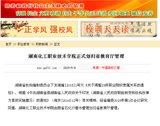 中国高校之窗:湖南化工职业技术学院正式划归省教育厅管理