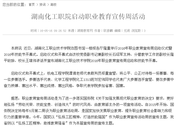 湖南教育网:湖南化工职院启动职业教育宣传周活动