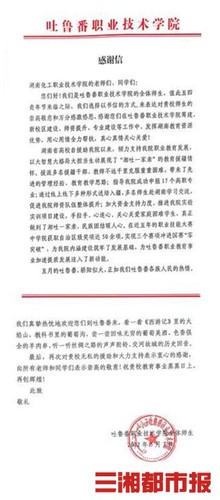 三湘都市报5月5日讯(通讯员 耿星 全媒体记者 刘镇东 黄京)五四前夕,吐鲁番职业技术学院全体师生向湖南化工职业技术学院发来感谢信,以书信的方式,表达对学校的敬意,感谢学校在吐鲁番职业技术学院筹建、新校区建设、师资提升、专业建设等工作中,发挥湖南教育资源优势,用心用情全力帮扶,真心真情关心关爱。
