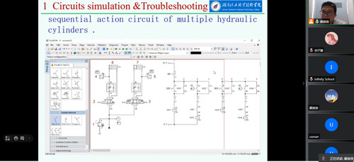 巴基斯坦Infinity工程学院是湖南化工职业技术学院的友好合作院校,也是该校在巴设立的现代化工制药教学实训基地。Infinity工程学院8名学员曾到湖南化工职业技术学院开展化工、机电、自动化专业的短期实训。今年7月,Infinity工程学院提出液压软件培训需求,希望湖南化工职业技术学院能尽快对其教师进行培训。湖南化工职院领导高度重视,立即组织国际交流处、成培处、机电工程学院负责人碰头研讨合作方案,决定举办一期液压气动仿真软件(Fluidsim)线上培训班。时间紧、任务重,戴俊良老师作为此次培训讲师,在接到任务后便精心准备,认真制定教学计划,制作教学课件,克服困难,使得培训终于在暑期顺利开班。培训一共8天,共32学时,主要针对Fluidsim软件进行模拟教学,包括在fluidsim中绘制液压/气压/电气控制回路图和plc程序图,对回路进行模拟仿真,验证是否满足实际工况需求,对实际系统中的故障进行模拟分析,在软件中完成故障排查和修正等。目前,培训进程已过半,Infinity工程学院对此次教学十分满意,并已提出下一期培训的计划和需求。