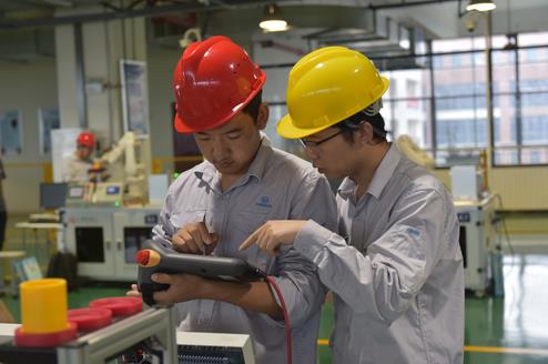 在接下来的4天半时间里,机电工程学院工业机器人技术团队对中国航空发动机集团员工逐项开展了工业机器人安全操作、ABB机器人仿真操作、机器人结构认识、机器人维护保养、工业机器人激光切割编程、工业机器人绘图编程、机器人坐标系设定、电机部件搬运及装配编程、旋转供料应用编程、变位机应用编程编程、工业机器人RFID应用编程、工业机器人视觉应用编程等内容的培训,并悉心指导学员开展了相关实操训练。