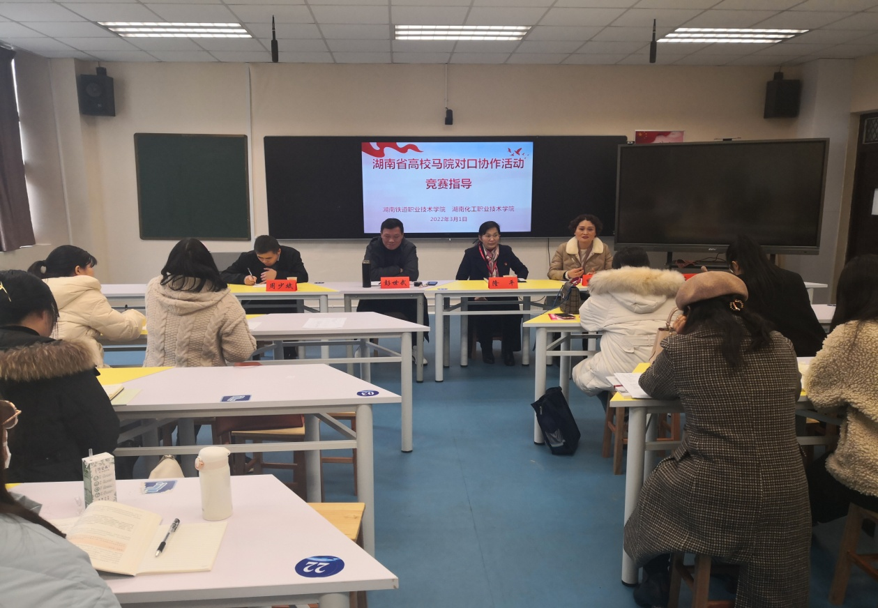 3月1日,湖南化工职业技术学院马克思主义学院在励志楼408教室开展省高校马院对口协作活动,对口协作单位湖南铁道职业技术学院马克思主义学院院长田文艳、副院长周少斌到校指导,湖南化工职业技术学院副校长隆平出席活动并讲话,马院党总支书记李纯斌及全体教师参加活动,活动由马院院长彭世武主持。