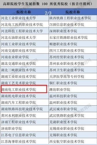 近日,全国职业高等院校校长联席会议发布了《关于公布高职院校学生发展指数优秀院校名单的通知》,湖南省有9所高职院入选,湖南化工职业技术学院位列其中,成为高职院校学生发展指数100所优秀院校之一。