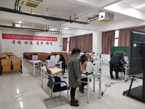 决赛当天,入围决赛的33个参赛代表队262个参赛团队,分28个云上比赛室、上下午两场进行比赛。上午中职组15个比赛室、下午高职组13个比赛室,每场4个小时。同一场次参赛团队在完成身份核验和比赛检录后,随机抽取参赛作品中两份教案并选定教学展示内容,用3个小时时间在同一教学场地同步完成参赛作品教学实施报告介绍、自选教学内容展示并录制视频,并按照要求上传到指定平台。学校按决赛工作要求,建设了28个云上比赛室,分别安排两名工作人员,组织各比赛室参赛教学团队的检录、抽签,并在线监控、记录所有参赛教学团队赛场活动。工作组织严密、流程规范,工作人员操作严谨、细致、热情、周到。