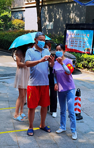 在株洲嵩山路街道香山社区第二轮核酸检测现场传来一声声清脆而响亮的声音,“请大家提前打开健康码和行程码,准备好身份证,保持一米距离排队?!薄扒氪蠹也灰偶?,我们检测采样非常快的,不会耽误太长时间的?!薄扒肽骱每谡?,这样才能保护好自己。”检测现场,作为志愿者的熊美珍老师,积极引导着居民有序排队、准确填写信息。社区老人比较多,每当看见腿脚不利索的老人和对智能手机使用不太熟练的老人时,熊美珍老师都会主动上前帮助,耐心而细致地帮助老人解决困难,让他们安全、安心地接受采样检测。
