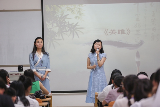 2018年6月14日,湖南化工职业技术学院思政课教师李菡(左一)和语文课教师邓滢(右一)共同带来了一堂特别的思政课。罗治国/摄