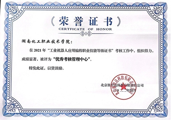 近日,北京赛育达科教有限责任公司发布了《2021年“1+X”试点工作先进个人及优秀单位获奖的通知》,继2020年度后,湖南化工职业技术学院“工业机器人应用编程“1+X”证书考核管理中心”再度荣获“优秀考核管理中心”。