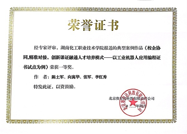 湖南化工职业技术学院工业机器人技术专业以“1+X”证书为桥梁,校企协同,精准对接,创新课证融通人才培养模式,为社会培养高素质应用型的人才。该模式带动了校内其它专业和证书的试点,并在湖南省乃至全国范围内起到了良好的示范引领作用。此外,学校报送的典型案例作品《校企协同,精准对接,创新课证融通人才培养模式——以工业机器人应用编程证书试点为例》荣获一等奖。