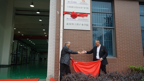 湖南化工职业技术学院校长陈超与株洲中车天力锻业有限公司党总支副书记、总经理郑业方代表校企双方签订了校企共建“新材料工程产业学院”协议,并向株洲中车天力锻业有限公司进行了“新材料工程产业学院”授牌。王雄伟与韩军在工业中心楼前为“新材料工程产业学院”揭牌,学校和株洲中车天力锻业有限公司共建的“新材料工程产业学院”正式成立。