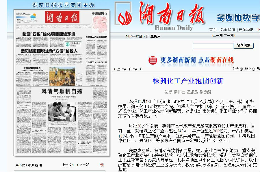 2013年12月14日湖南日报报道我院:株洲化工产业抱团创新。