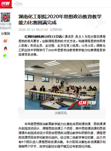 红网时刻株洲10月13日讯(通讯员 吴兰)为充分落实课程思政的有关要求,创新课程思政的方式方法,构建课程思政协同育人机制,形成全员、全过程、全方位育人格局,10月10日,湖南化工职业技术学院举行了2020年思想政治教育教学能力比赛课程思政说课项目决赛。