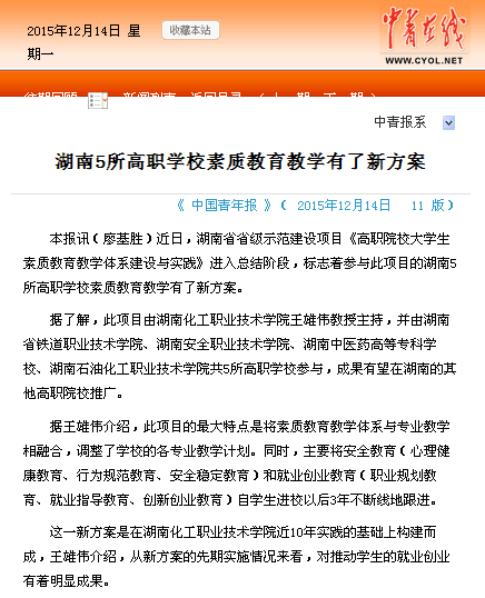 中国青年报:湖南5所高职学校素质教育教学有了新方案