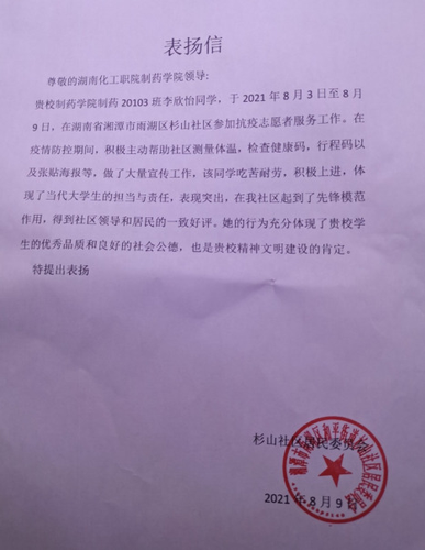 药品生产技术20103班李欣怡,积极参加湘潭市雨湖区杉山社区志愿服务。负责提醒来往人员佩戴好口罩、张贴海报、检查健康码、测量体温等志愿服务。因志愿服务认真负责,起到了先锋模范作用,获得了社区领导和居民的一致好评。 疫情防控是广大青年践行初心使命、体现责任担当的试金石和磨刀石。她坚信在所有人的共同努力下,一定会早日战胜病毒。