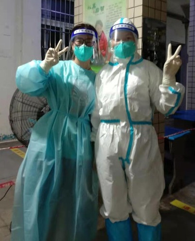 彭慧伶穿着厚厚的防护服与一起战斗的医护人员合影