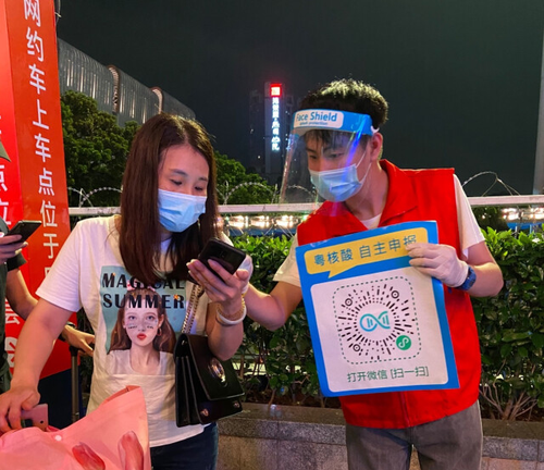 8月7日晚上6点,在深圳北站出口,湖南化工职院自动化1912班徐俊杰同学正在维护乘客秩序,检查每一位排队进行核酸检测人员的健康码,并测量体温,提醒他们“出示健康码,带好口罩”,引导乘客完成核酸检测步骤。短短的一句话在几个小时里重复了几百遍,忙忙碌碌连水都顾不上喝。