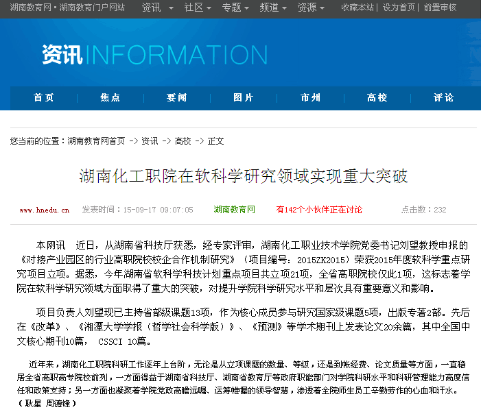 湖南教育网:湖南化工职院在软科学研究领域实现重大突破