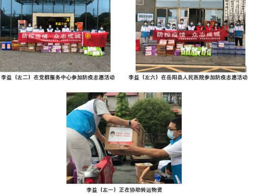 李益在第一时间自愿报名参加了此次战“疫”活动,他的工作是帮助爱心物资送到岳阳县人民医院和岳阳县汽车站两处“一线”战地。为更快将慰问一线防疫人员、志愿者的物资能够转载完毕,即使汗流浃背、腰酸背痛,也毫无怨言。志愿者们的行动得到了岳阳有关媒体的报道。李益表示,作为一名大学生,同时又是一名光荣的预备党员,要积极加入到防疫的一线工作中去,为家乡防疫工作贡献自己的力量,始终牢记全心全意为人民服务的宗旨,相信在大家的努力下一定能打赢这场疫情防控阻击战!