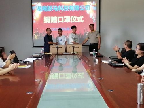 红网时刻株洲9月11日讯(通讯员 洪礼章 刘志芳 耿星)9月8日,湖南化工职业技术学院大三学生吴显、刘心代表自己创办的公司“湖南跃马科技有限公司”向该校自动化与信息工程学院捐赠了5000个口罩,自动化与信息工程学院院长欧阳广和党总支书记许建平出席捐赠口罩仪式,接受捐赠。