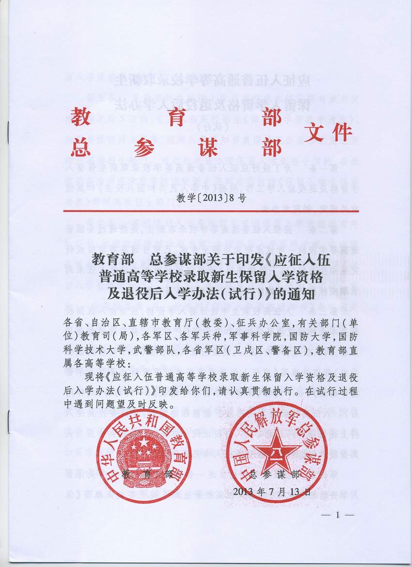 附: 教育部、总参部教学〔2013〕8号《应征入伍普通高等学校录取新生保留入学资格及退役后入学办法(试行)》