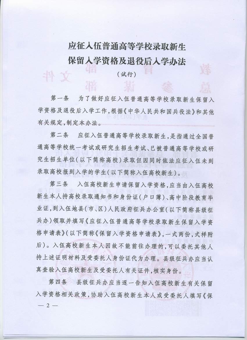 2.县级征兵办告知保留入学资格相关政策后审核入伍高校新生保留入学资格,在申请书上加盖县级征兵办公章。