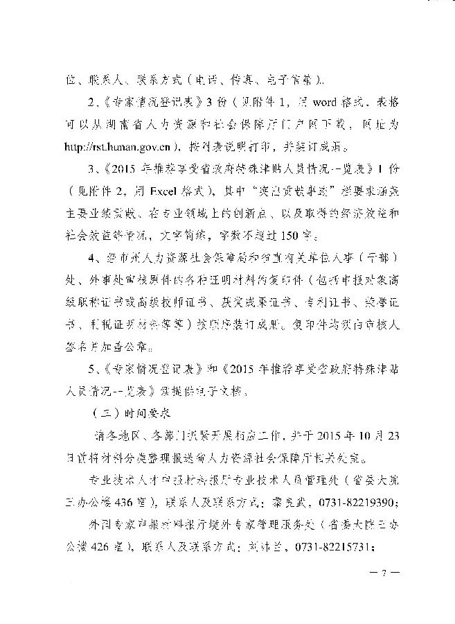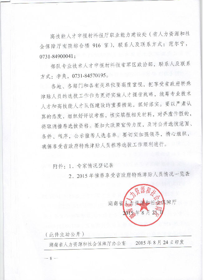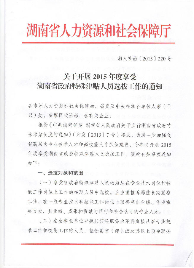 转发:关于开展2015年度享受湖南省政府特殊津贴人员选拔工作的通知(湘人社函(2015)220号)