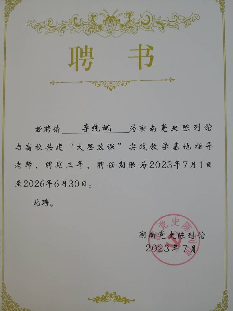 随后,举行了共建基地指导老师聘请仪式,李纯斌被省党史陈列馆与高校共建“大思政课”实践教学基地聘为指导老师。