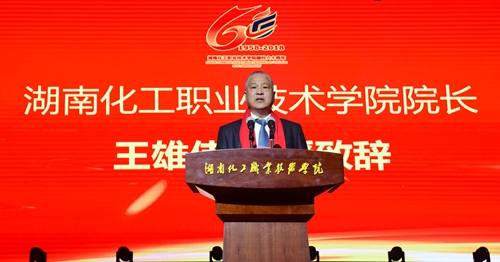 校长王雄伟在致辞中回顾了学校60年的发展历程与办学成就,展望了学校未来发展的美好愿景。他说,六十载栉风沐雨,薪火相传,湖南化工职业技术学院顺应民族振兴的时代召唤,肩负传承教泽的历史使命,主动适应经济社会发展新趋势、新常态,积极推动转型发展,大力实施内涵提升、特色发展和开放办学战略,已经发展成为拥有在校师生一万三千余人、专业体系完备、师资力量雄厚、教育教学质量过硬、科研成果丰硕、办学特色鲜明的全省乃至全国知名高职院校;六十载沧桑砺洗,春华秋实,一代代化院人扎根于这片职教热土,汲取先贤智慧,胸怀崇高理想,艰苦卓绝,玉汝于成,铸就了一部可歌可泣的创业史、奋斗史和改革发展史,积淀形成了艰苦创业、自强不息的进取精神与学而不厌、诲人不倦的治学品格以及明德至善、负重担当的家国情怀;六十载春风化雨,芳菲成林,校友们互爱互助,携手共进,建功立业,在各行业各领域获得了很高的赞誉,为社会、为国家做出了突出贡献,为母校赢得了荣誉和光彩;六十载时光流转,记忆永恒,在各级领导、社会各界和广大校友的关心与支持下,在一代代化院人的无私奉献中,湖南化工职业技术学院从小到大,在竞争中求生存求发展,书写了光辉的篇章。王雄伟表示,庆祝湖南化工职业技术学院60周年华诞,既是对光辉历史的检阅,也是新的跨越的开始。站在新的历史起点上,全体化院人将为了化工职院更高的荣耀,紧抓机遇、干事创业;为了化工职院更好的发展,勇于担当、努力拼搏;为了化工职院更美好的未来,开拓创新、奋发进取。学校致力于建设“当地离不开、业类都认同、国际可交流”的人民满意的高等职业学院,创造无愧于新时代的新辉煌。