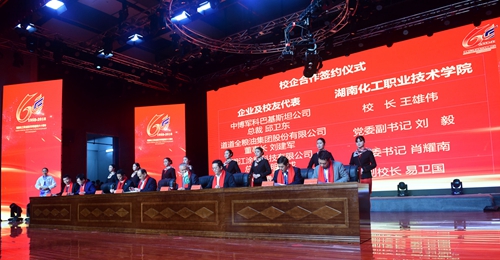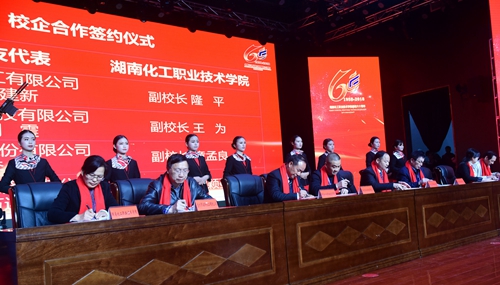 会上隆重举行了校企合作签约仪式。学校与中博军科巴基斯坦公司、道道全粮油集团股份有限公司、湘江涂料科技有限公司、广州市梦采生物科技有限公司、惠州市宙邦化工有限公司、湖南宏旺环??萍加邢薰?、武汉华中数控股份有限公司、巴陵石化大成检修安装公司等现场签订校企合作协议。据不完全统计,校庆期间,学校共签约校企合作项目达百余项。