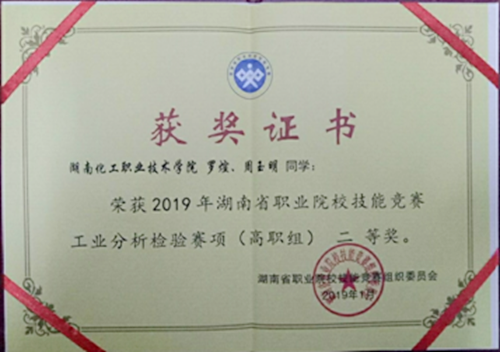 近日,由湖南省教育厅主办、我校承办的2019年湖南省职业院校技能大赛高职组“工业分析检验”赛项在我校举行。此次大赛共有6个学校12支队伍参赛,经过三天的激烈角逐,我校选手再创佳绩,杨粤馨、段绣程获得高职组团体一等奖,罗煊、周玉明获得高职组团体二等奖。