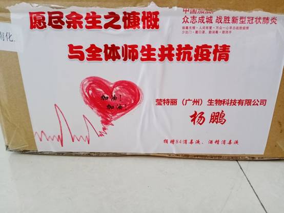 2月26日,学校收到我校08届校友莹特丽(广州)生物科技有限公司杨鹏董事长捐赠的防疫物资:84消毒液50大件,消毒用酒精12大件。在全国上下众志成城,抗击新冠肺炎的关键时期,消毒液等物资非常短缺,特别是面对师生开学后大批量消毒工作,杨鹏及时伸出援助之手,用实际行动表达对母校的厚谊、对师生的关怀,体现校友企业强烈的社会担当,不仅解决了学校的燃眉之急,还为母校应对疫情注入了强大的精神力量。
