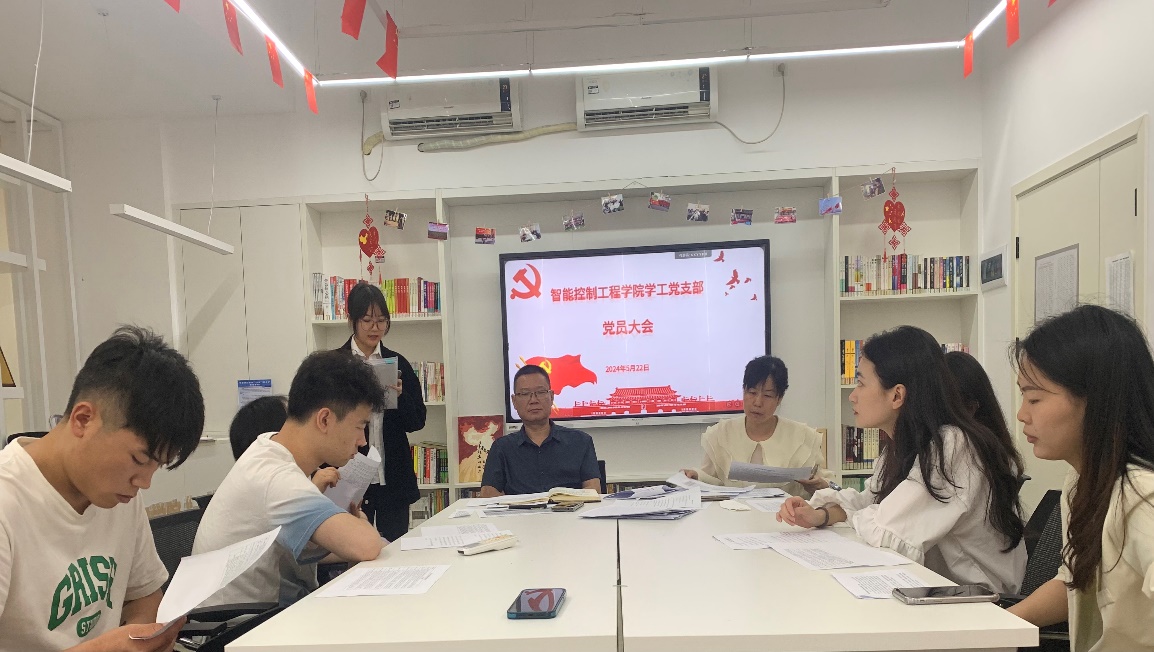 2024年5月22日,智能控制工程学院学工党支部于3栋一站式社区顺利召开接收预备党员支部大会。智能控制工程学院党总支书记陈峰出席会议,7名正式党员参加了会议,会议由唐恬恬主持。