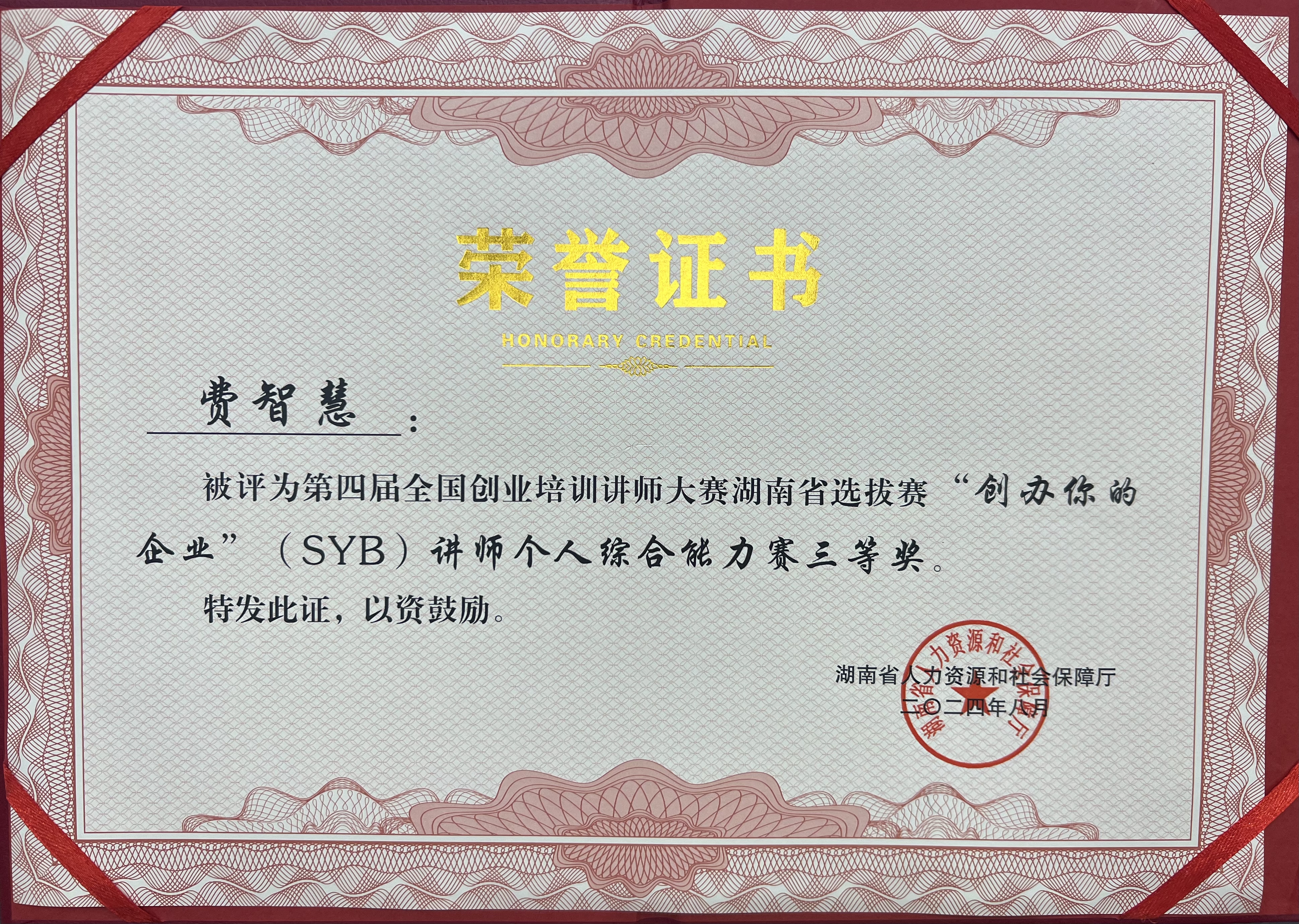 第四届马兰花全国创业培训讲师大赛湖南省选拔赛“创办你的企业”(SYB)讲师个人综合能力赛 三等奖 |