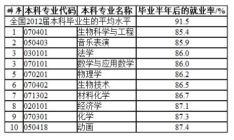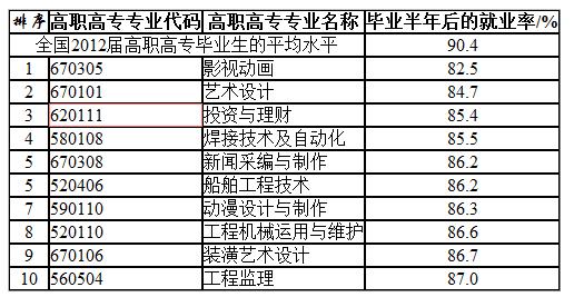 麦可思撰写《2013年中国大学毕业生就业报告》(就业蓝皮书)中分析指出:本科院校2012届大学毕业生毕业半年后的就业率为91.5%,高职高专院校2011届毕业生毕业半年后的就业率为90.4%。但是,很多热门专业的就业率并没有达到这个水平。以动画专业为例,其失业率多年走高,在近3年内是失业量最多的10个专业之一。