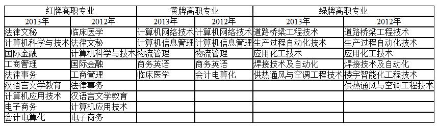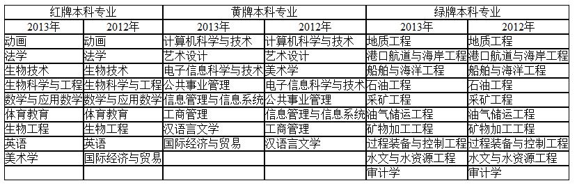 麦可思综合分析2009—2012届的大学生就业报告,总结得出2012年和2013年中国大学“红黄绿牌”本科和高职专业名单。需要说明的是:“红牌”专业是失业量较大,就业率较低,月收入较低且就业满意度较低的专业,为高失业风险型专业;“黄牌”专业是除“红牌”专业外,失业量较大,就业率较低,月收入较低且就业满意度较低的专业;“绿牌”专业是月收入、就业率持续走高,失业量较小且就业满意度较高的专业,为需求增长型专业。