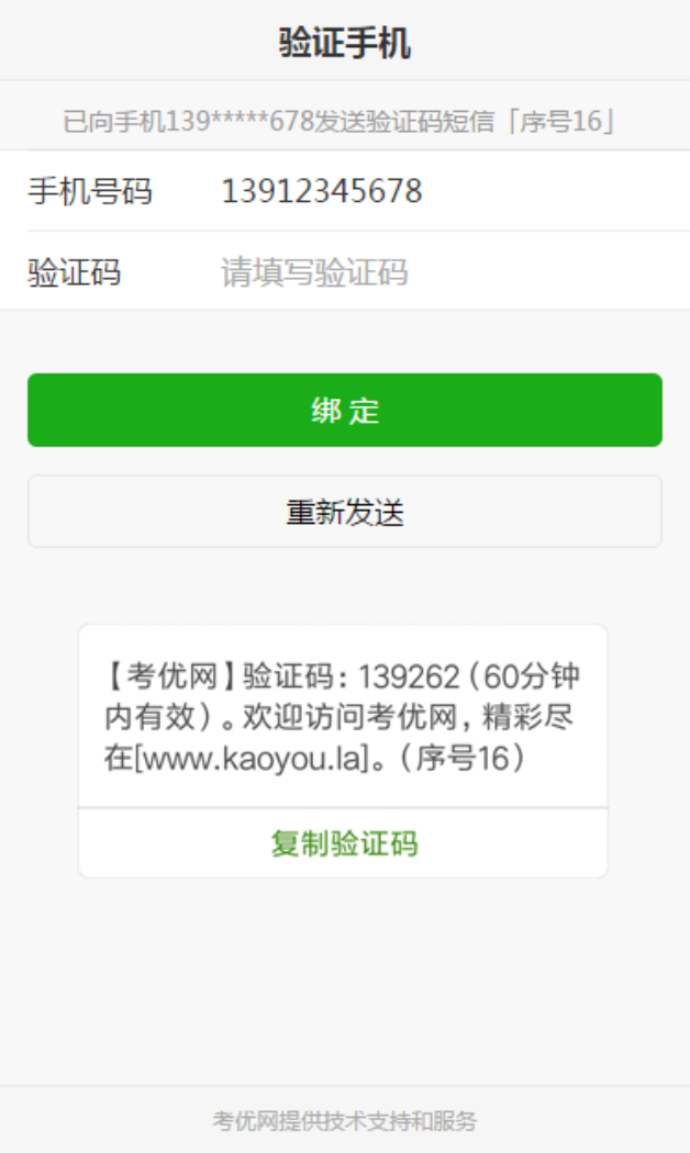 为便于联系考生,缴费前需验证考生联系电话的有效性。系统向考生手机发送随机验证码短信,考生收到验证码短信后,填写收到的验证码完成验证。