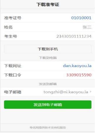 支付完成后,点击“打印准考证”按钮可以下载准考证,下载提供三种方式:下载到手机、下载到电脑、发送到电子信箱。