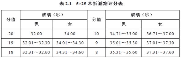 1.考试方法:考生从起跑线向场内垂直方向快跑,在跑动中依次用手击倒位于5米、10米、15米、20米和25米各处的标志物后返回起跑线,要求每击倒一个标志物须立即返回一次,再跑到下一个标志物,以此类推??忌σ哉玖⑹狡鹋?,脚动开表,完成所有折返距离回到起跑线时停表,记录完成的时间。未击倒标志物,成绩无效。每人测试1次。