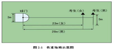 (1)考试方法:如图2-1所示,传球目标区域由一个室内五人制足球门(球门净宽度3米,净高度2米)和以球门线为直径(3米)画的半圆组成,圆心(球门线中心点)至起点线垂直距离为男子28米,女子23米??忌虢蛑糜谄鸬阆呱匣蛳吆螅ㄏ叱?米,宽0.1米),向目标区域连续传球5次,左右脚均可,脚法不限。