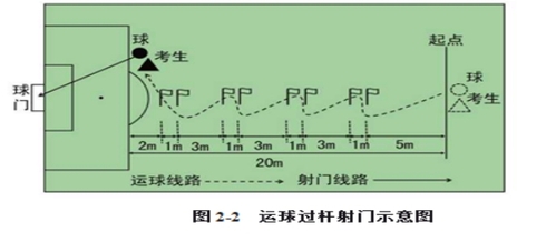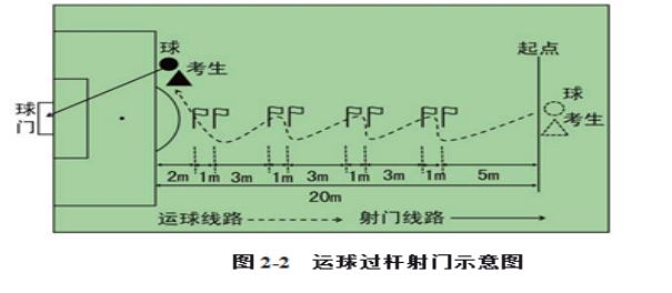 (1)考试方法:如图2-2所示,从罚球区线中点垂直向场内延伸至20米处,画一条平行于球门线的横线作为起点线。距罚球区线2米处起,沿20米垂线共插置8根标志杆。考生将球置于起点线上,运球依次绕过8根标志杆后起脚射门,球动开表,当球从空中或地面越过球门线时停表,记录完成的时间。凡出现漏杆、射门偏出球门,球击中横梁或立柱弹出,均属无效,不计成绩。每人测试2次,取最好成绩。