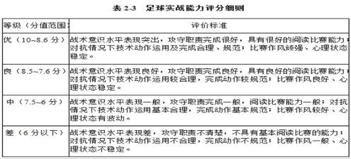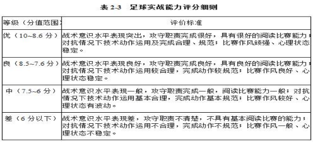 2.评分标准:考评员参照实战能力评分细则(表2-3),独立对考生的技术能力、战术能力、心理素质以及比赛作风等方面进行综合评定。