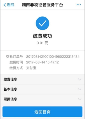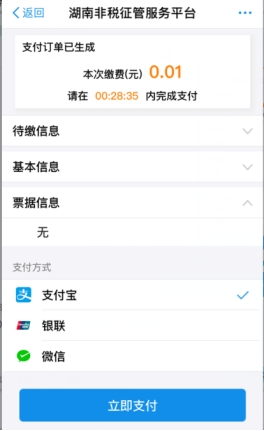 用户可以点击待缴信息、基本信息、票据信息查看详细信息,确认无误后,选择支付宝、银联、微信其中一种支付方式,完成支付。支付完成后,跳转至支付成功界面,即完成支付,支付成功界面如下图: