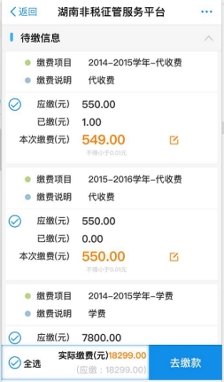 湖南非税征管服务平台移动缴费平台为湖南用户提供非税移动缴费服务。用户只需关注湖南非税征管服务平台的微信公众号、支付宝生活号,就能通过手机完成相关缴费业务,比如教育学费、交通违章、质监、工商等。