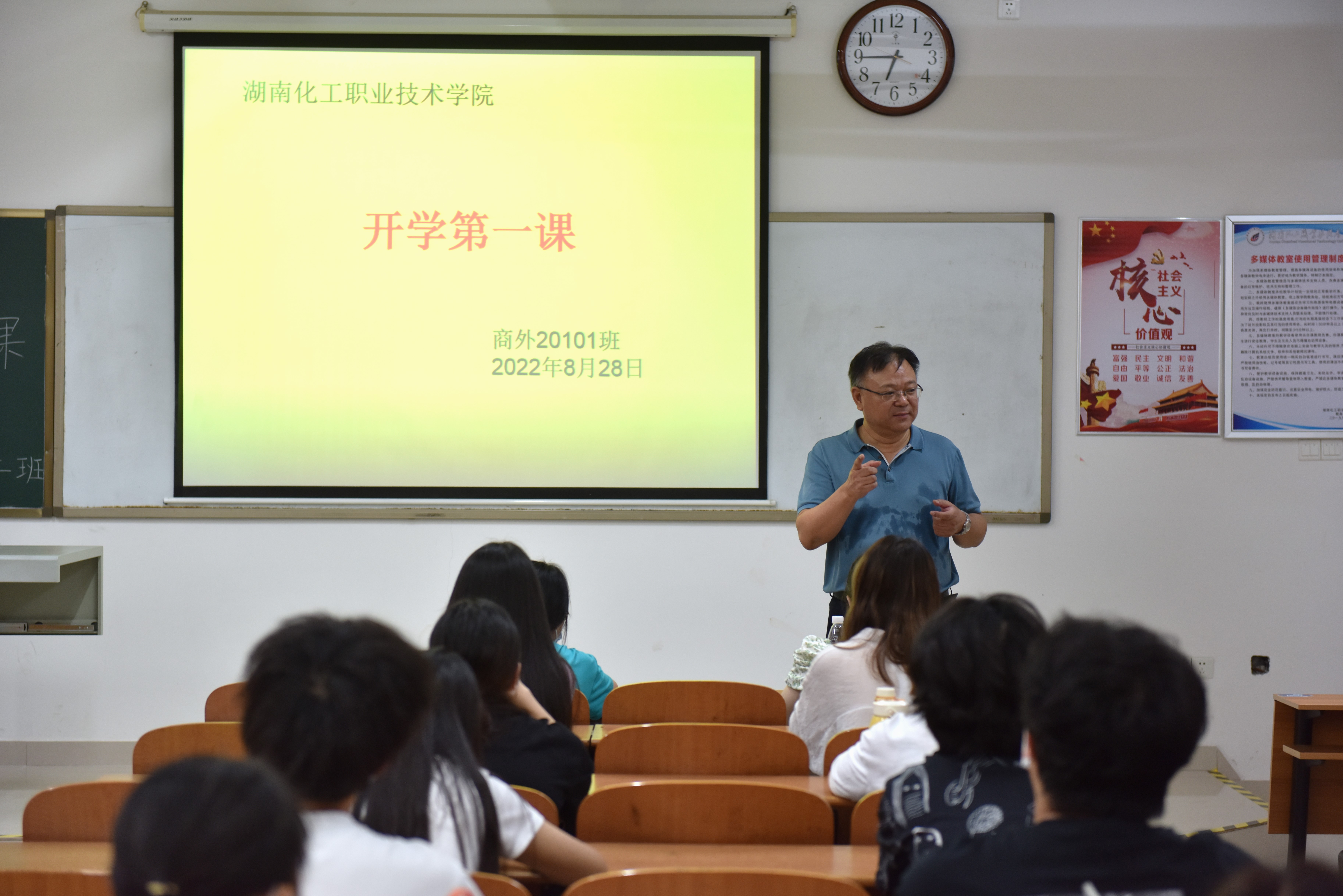 下午三点半,根据班级安排,商外20101班导师、陈超准时走进励志楼217教室,首先询问班级学生到校情况。他结合当前疫情防控形势,强调学生日常防疫的重要性,科普了日常防疫知识和学校开学后的疫情防控要求,强调学生要加强安全意识。在讲课过程中,他讲到暑期开展“万名教师进万家”大家访活动的感受,在一路走访的学生中,有1名学生就是该班的家庭贫困学生。他讲到党的二十大,提到乡村振兴,为学生描绘未来美好蓝图;讲到访企拓岗,当前学生就业创业的形势,勉励学生树立正确的择业就业观,在校扎实学习,练就过硬技能,成为合格人才,毕业后走向社会报效国家,成就自我。
