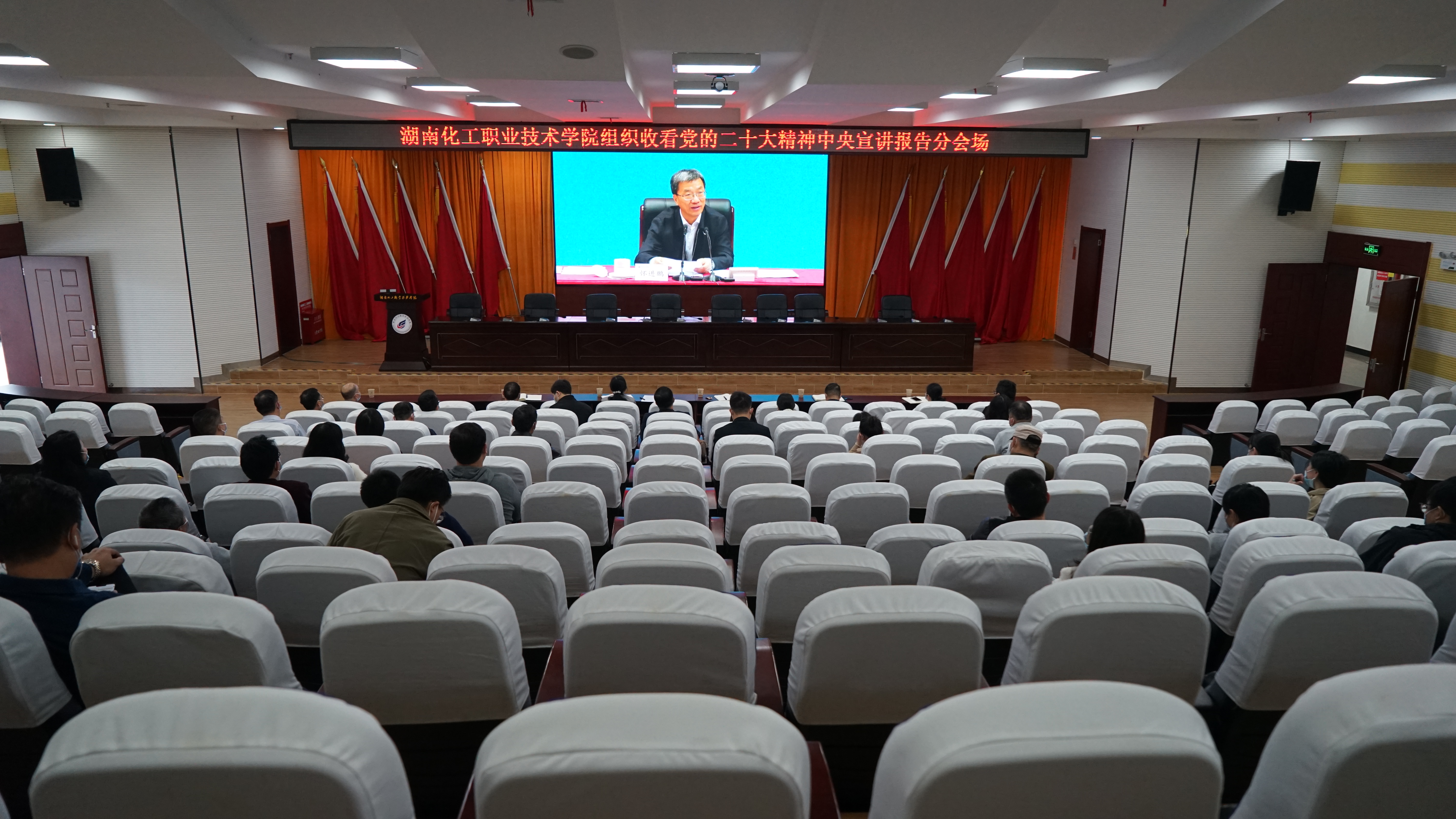11月3日上午,学校组织收看党的二十大精神中央宣讲团宣讲报告会。中央宣讲团成员,教育部党组书记、部长怀进鹏作宣讲报告。学校全体党委委员,学工部、团委科级以上干部,各二级学院党总支副书记、辅导员,马克思主义学院全体教师等在湖南化工职业技术学院分会场收看。