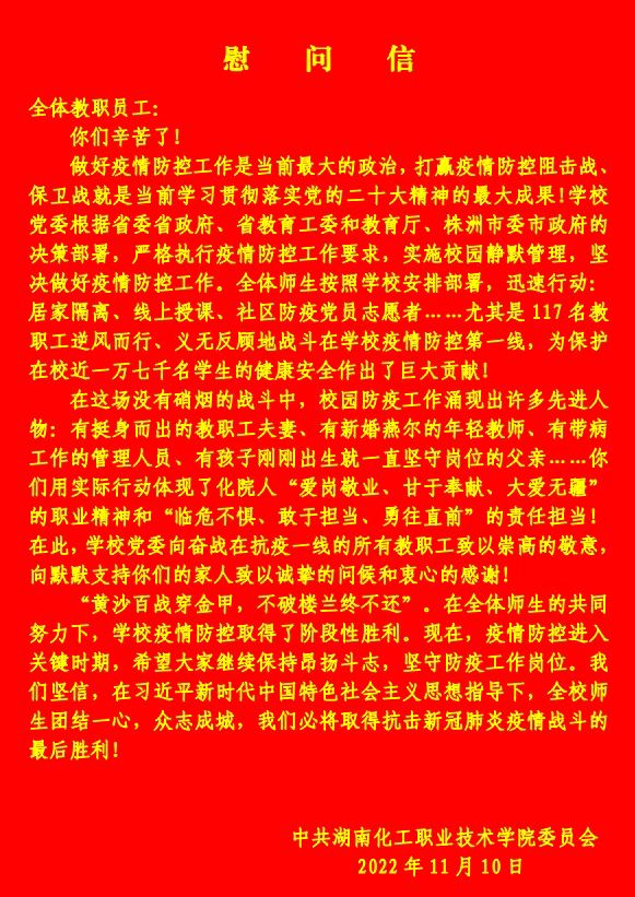 疫情当前,坚持就是胜利,抓实则曙光在前。我校将自觉在思想上政治上行动上同党中央保持高度一致,严格落实《关于进一步优化新冠肺炎疫情防控措施科学精准做好防控工作的通知》(联防联控机制综发〔2022〕101号)精神和省委、省政府、省教育厅疫情防控专题会议要求,弘扬伟大建党精神和伟大抗疫精神,统筹疫情防控和教育教学事业发展,奋力夺取疫情防控与教育事业高质量发展的双胜利,以实际行动贯彻落实党的二十大精神,努力向党和人民交上一份满意的答卷。