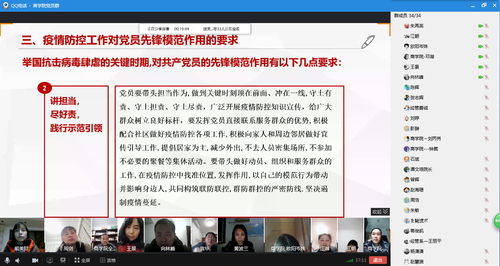 童孟良副校长结合当前防疫工作实际情况,引用数字、实例和事迹等多种方式,从“提高站位,认清当前防疫形势”“ 深刻领会什么是共产党人的先锋模范作用”“疫情防控工作对党员先锋模范作用的要求”三个方面全面介绍了当前防疫工作的现状,并对全体党员同志在疫情防控期间的工作提出了新的要求。他要求大家要做到:一个党员就是一面旗帜,一个支部就是一座堡垒,继续发挥基层党组织战斗堡垒作用和共产党员先锋模范作用;要充分发挥共产党员立足本职、带头奉献、担当作为的先锋模范作用,把做好疫情防控工作作为守初心、担使命的生动实践。他强调,只有党员首先站出来、敢于冲上去,把群众带动起来、凝聚起来,众志成城、攻坚克难,才能紧紧依靠人民群众坚决打赢疫情防控阻击战。