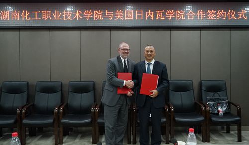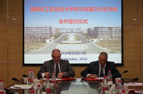 王雄伟校长和卡尔文 L. 特鲁普校长分别代表湖南化工职院和日内瓦学院签定合作协议